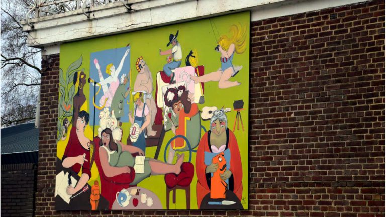 « L’atelier des artistes » est une fresque de 10m2 réalisée durant l’hiver 2024 pour l’asbl Vie Féminine de la ville de Huy. Le financement de la réalisation a été obtenu dans le cadre d’un appel à projet « A nous la rue », une initiative de l’Institut pour l’égalité des femmes et des hommes. Suite à une proposition de dessin que j’ai réalisée en concertation avec le groupe des bénévoles et membres de Vie Féminine, j’ai adapté sur 3 panneaux de bois multiplex pour le confort et une installation aisée durant une période où le climat ne permet pas de travailler en extérieur.