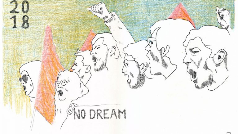 Illustration réalisée pour l’exposition de Kult Magazine de novembre 2018 à Liège. L’illustration fait référence aux manifestations étudiantes en France contre les diverses lois Macron.