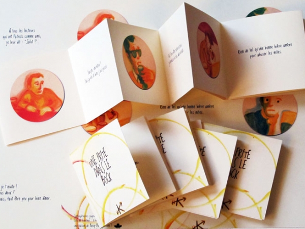 « Une Frite dans le bock » est un petit livre accordéon de contrepèteries joyeuses illustrées de portraits dessinés sur des sous bocks !