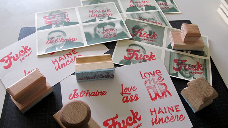 Le vernissage du 6 novembre 2019 de l’exposition collective à La Zone, fut le moment d’expérimenter la capacité de rébellion du public face au pouvoir établi et leurs représentants. Une rébellion douce, exutoire et bon enfant dont l’acte consistait à tamponner le portrait d’un ou plusieurs dirigeants politiques belges et étrangers. Les messages des tampons sont explicites mais leurs agressivités sont atténuées par l’esthétisme de la typo ainsi que l’ironie d’un amour contraire. Je n’ai pas fait de photos de l’installation ni du public utilisant les tampons, le moment était plus au débat qu’à l’image. Certains étaient réticents au concept, d’autres (plus nombreux) enjoués par l’expérience. Un grand merci aux liégeois qui ont participé à cette petite dissidence d’un soir.