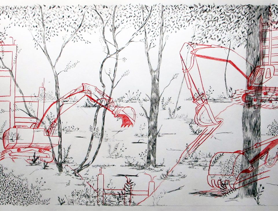 Différentes interprétations sont possibles à travers cette illustration au dessin simple mais évocateur : nature / industrie, destruction / construction , déforestation, urbanisation, etc… Je l’ai pensé au départ pour l’exposition collective de fin d’année de la Zone (Liège) sur le thème de la ville. Cependant, elle me semble décalée pour être comprise immédiatement par le spectateur. A voir… Les motifs simplifiés et leur superposition ont été inspirés des papiers peints des toiles de Jouy.